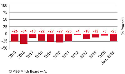 - in Süddeutschland um −9,7 Cent (−18,6 Prozent) auf 42,60 Cent pro Kilogramm Milch.
