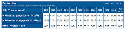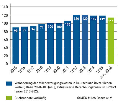 Der Milch-Marker-Index (MMI) lag im Januar 2026 bei 114 (2020 = 100) und damit unter dem Stand von Oktober 2025 (117) und dem Vorjahreswert von 2025 (119). Trotz gesunkener Milcherzeugungskosten von 52,58 Cent pro Kilogramm Milch (−2,20 Cent zum Vorjahr) hat sich die Wirtschaftlichkeit der Betriebe deutlich verschlechtert.